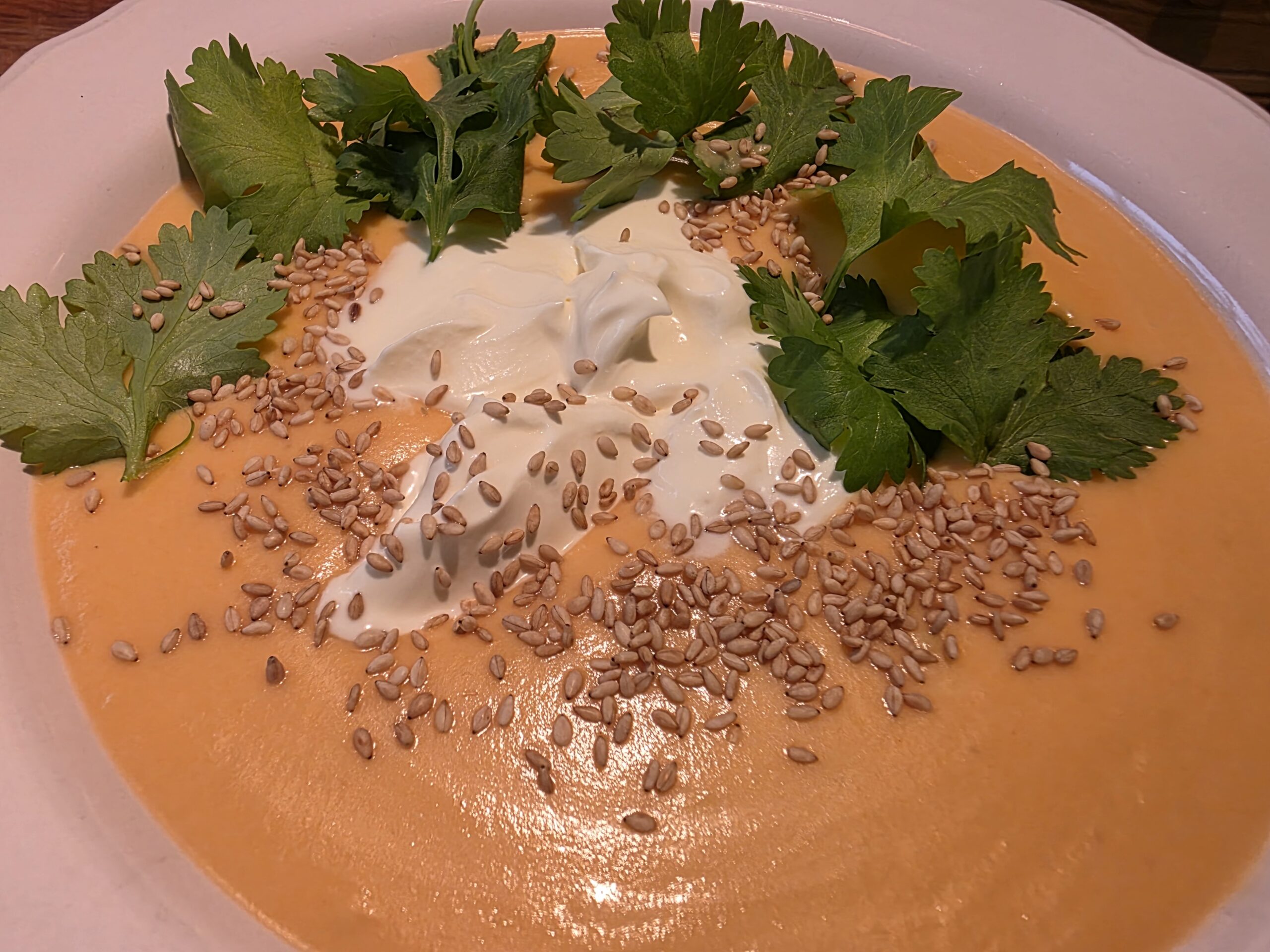 5. Till servering: Servera soppan med grädde, en klick yoghurt, rostade kärnor och koriander.